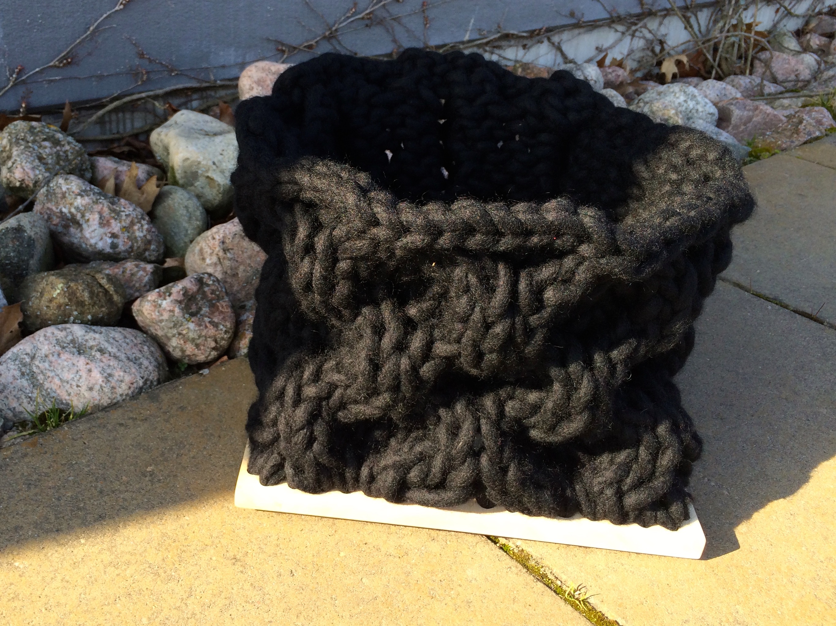 Tänkt slutresultat Prototyp. En stickad stor form, ca 50 cm hög, i Fanttigarn i honungskakemönster. Jag skulle gärna velat sticka en riktigt stor Kleinflaska, 1 meter hög, i Fanttigarn men det garn jag har räcker inte till det. Därför får jag avgränsa mej till något mindre. Men Fanttigarn får det bli och en form av något slag i honungskaketekniken eftersom jag gillar dess 3D-effekt med håligheterna. Jag tänker mej något sorts stickat rör. Det skulle kunna hänga som en mobil i en offentlig miljö, eller ljussättas som någon form av lampa. Men ett stickat rör kan också vara ett steg på vägen mot en stickad korg med t.ex. träbotten, en idé jag haft i bakhuvudet. Ja, det finns många vägar vidare från prototypen om man tänker vidare på produkt. Om jag hinner kan jag ev. göra ännu en prototyp i t.ex. riktigt grovt pappersgarn.
