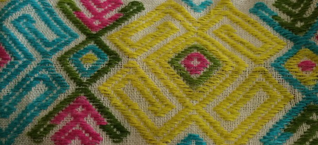 Hon provade även att brodera olika mönsterdetaljer ur Krabbasnår och laborerade med att vrida och vända på dom och se hur uttrycket ändrades. Kerstin tyckte att hon kom längre i vävningsexperimenten än med broderierna, eftersom som hon kunde mer om vävning än broderi.