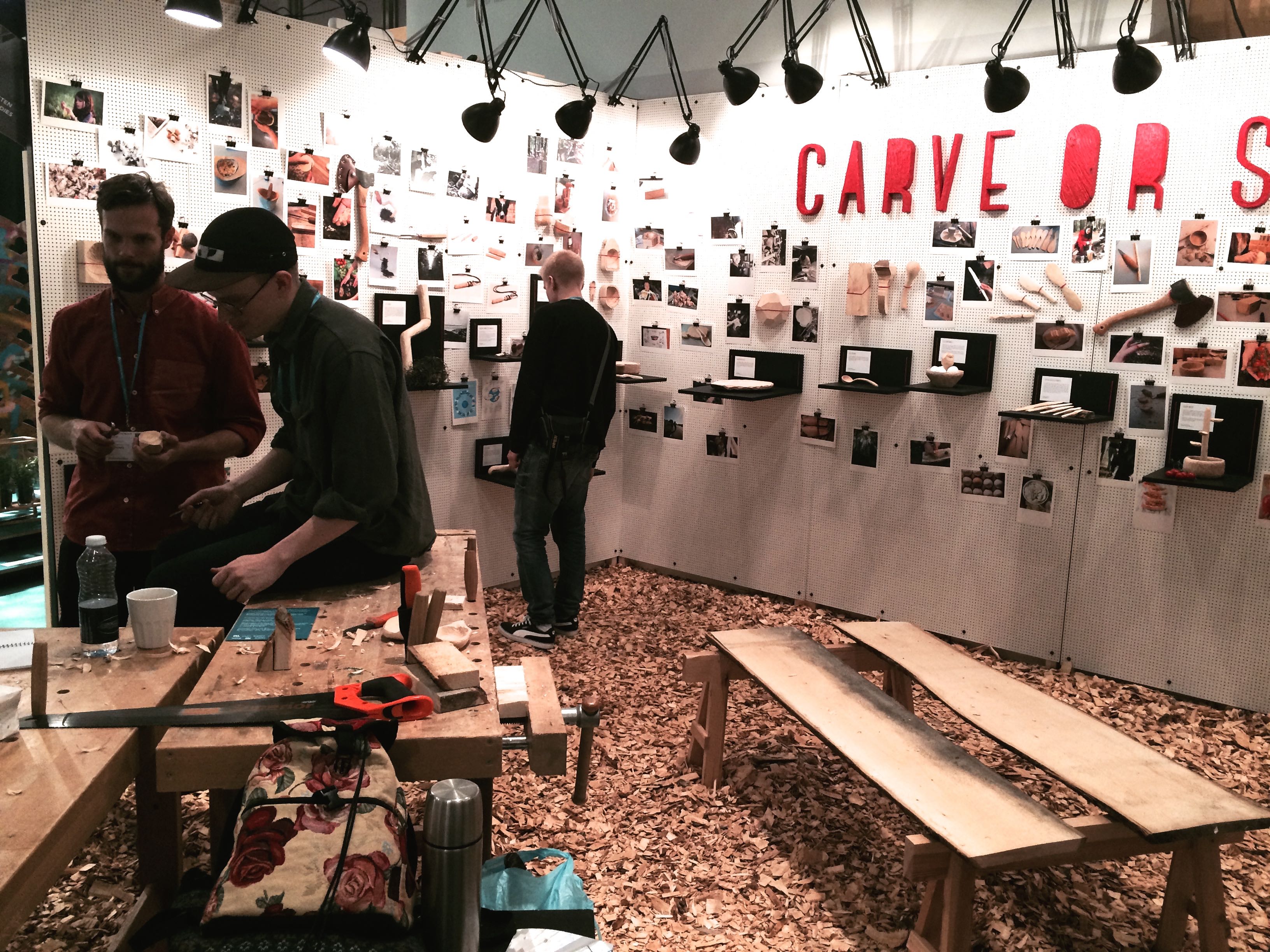 Gruset i Lomakkamontern var ett annorlunda inslag på mässan. Förra året på Möbelmässan hade Lunds universitet träspån i sin monter, minns ni det? Dom hade en hyvelbänk mitt i montern och satt där och täljde med golvet täckt av hyvel- och träspån. Doften av trä och känslan att gå där var go’. Det gillade jag också.