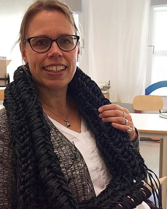 Glädje när examensarbetet tar form Slutspurten var intensiv med att få klart examensarbetet. Här är en lite suddig bild från när jag testar axelpartiets form. Min process har varit öppen där jag låtit materialet få styra formgivningen. Mina val av stickteknik, antal trådar,  stickornas grovlek och annat har också påverkat materialet. Men processen varit mer öppen än i mina tidigare projekt eftersom designen har utvecklats efterhand under arbetets gång. Startpunkten var att arbeta fram en krage som lyfte fram bäraren. Slutresultatet blev objektet PROUD. Mer om det kommer i bloggen.